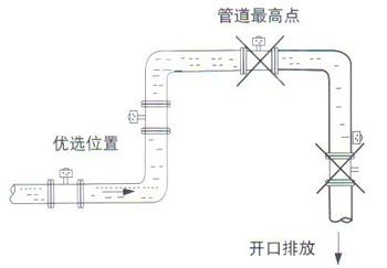 4.電磁流量計安裝位置介質(zhì)不滿管時,可采取抬高流量管后端管路的方法,使其滿管,嚴禁在管道最高點和出水口安裝流量計。(見圖)