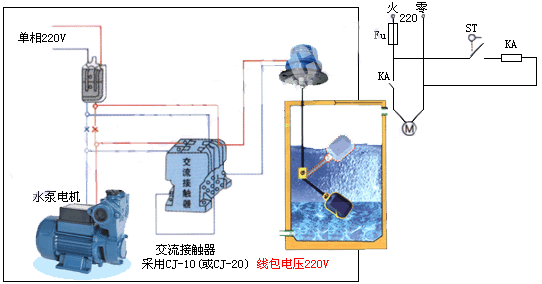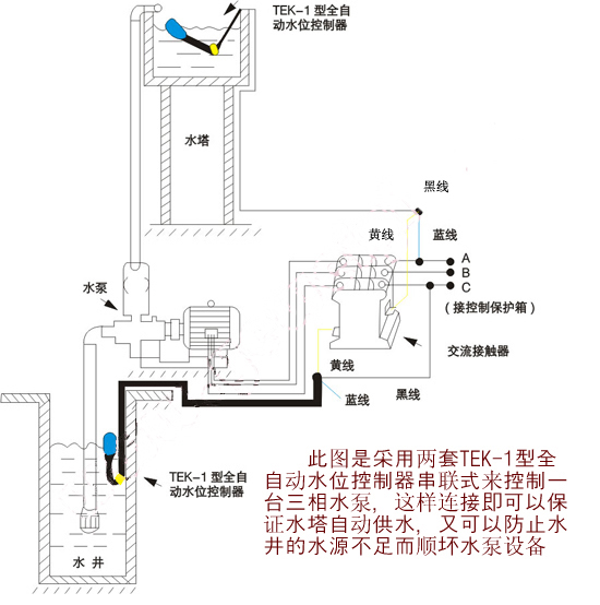 (tek-1)key電纜浮球液位開關是一個能夠調節桶、槽或井中液位的控制裝置。它可自動調節,易于操作,便于安裝,安全可靠,免予維修,無毒環保。它對污水有抵抗作用,廣泛應用于家庭,廠礦等的水池,油,酸和堿的池,桶,槽,灌等的容器中。如果聯兩個控制器。一個放至水塔,另一個放至水井中控制水泵,就能防止因水源不足開空泵而損壞水泵設備;也可以三有控制器串聯,一個放至水塔,另一個放過濾池和一個放至河水(水井)能同時控件,就能防止因水源不足開空泵而損壞水泵設備;也可以三個控制器串聯,一個放至河水(水井)能同時控制兩臺水泵設備。(可參考下圖)